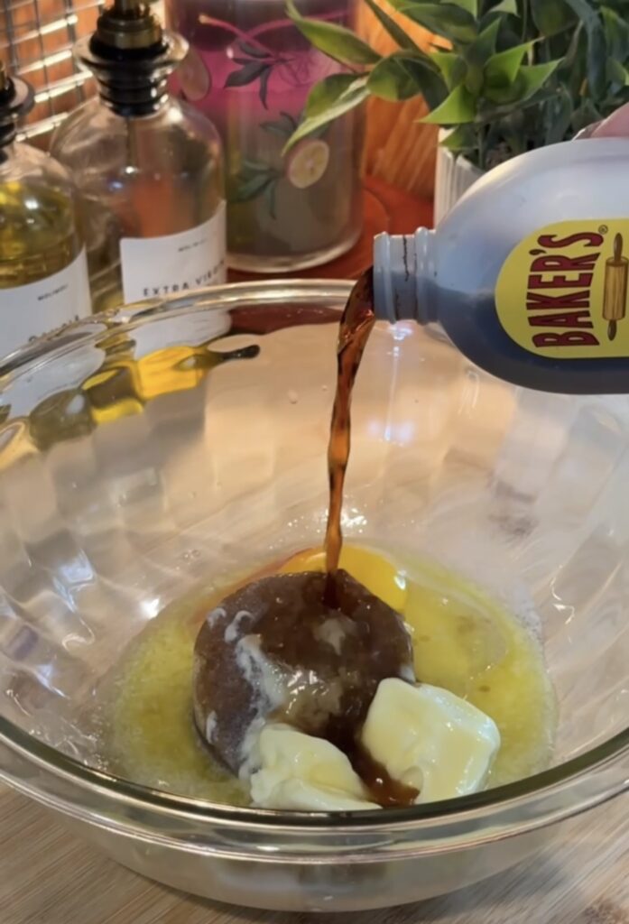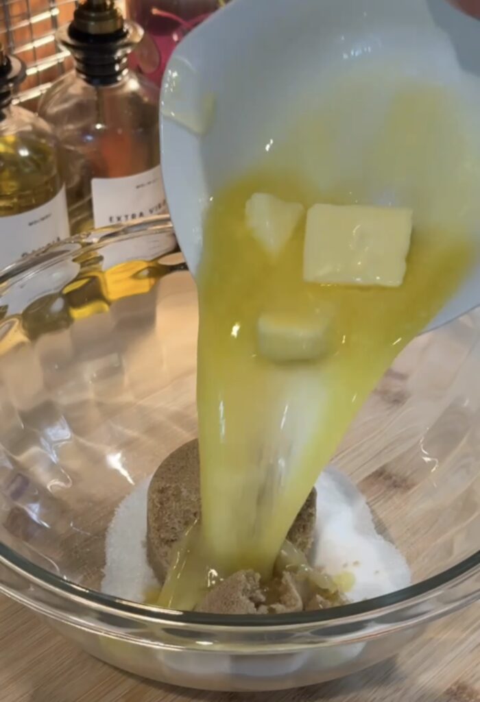 - Melt your butter until smooth, then whisk in both sugars, the egg, and vanilla extract until the mixture is silky and well combined.1 stick Butter, 1/2 cup Brown Sugar, 1/4 cup White Granulated Sugar, 1 large Egg, 1 tsp Vanilla Extract
