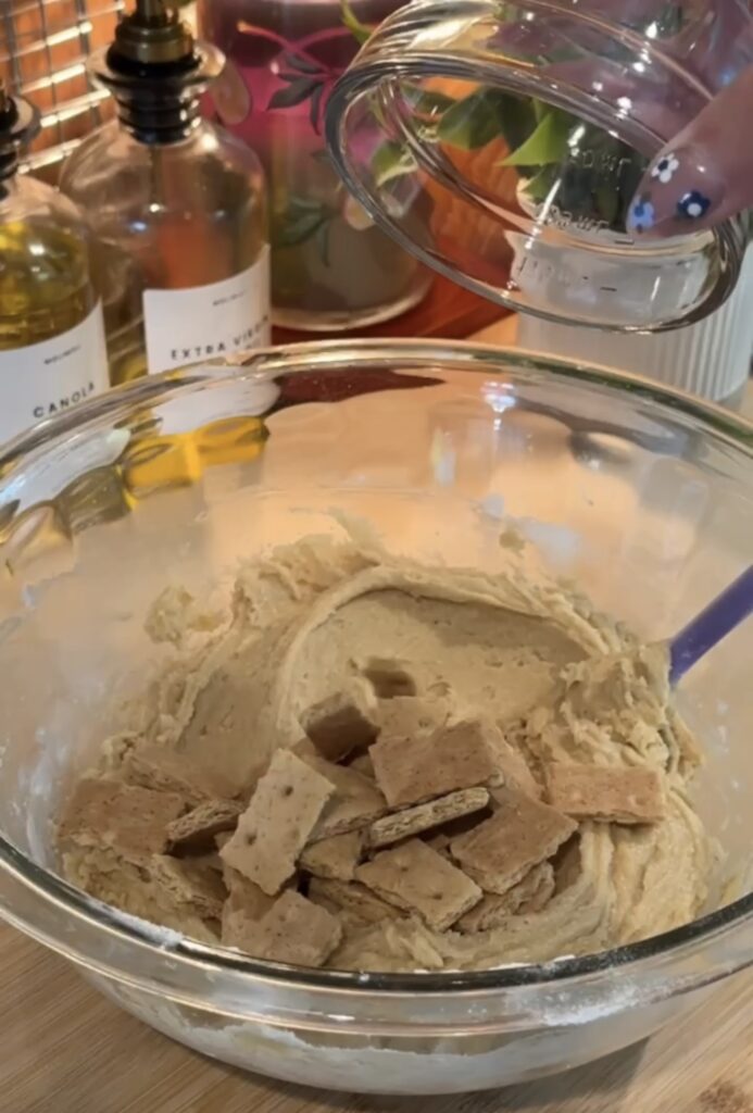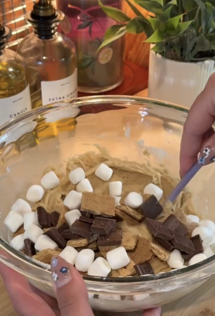 Now comes the fun part: stir in the mix-ins, adding pieces of graham crackers, chunks of chocolate (or chocolate chips if that’s what you have on hand), and plenty of mini marshmallows for that gooey campfire flavor.