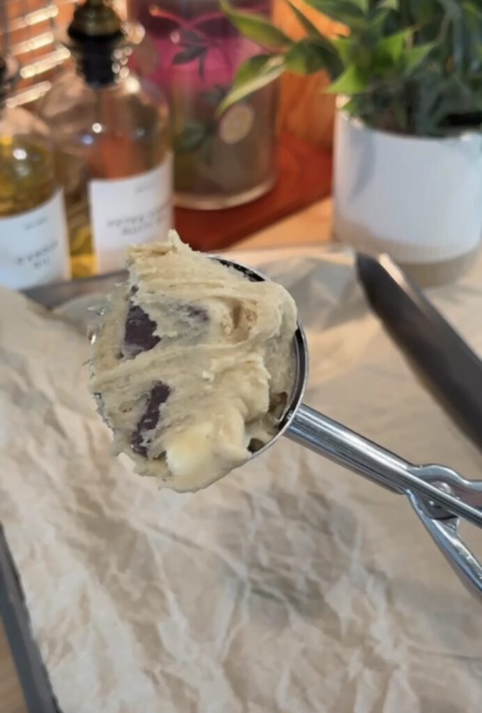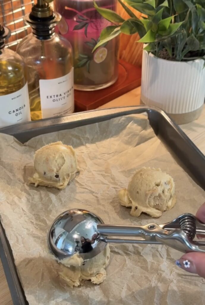 - Using a large cookie scoop, portion out the dough onto your prepared sheet, spacing each cookie about two to three inches apart since they’ll spread while baking.