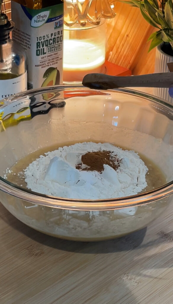In a separate bowl, stir together the flour, baking soda, baking powder, cinnamon, and a pinch of salt, then gently fold the dry ingredients into the wet mixture just until everything comes together.