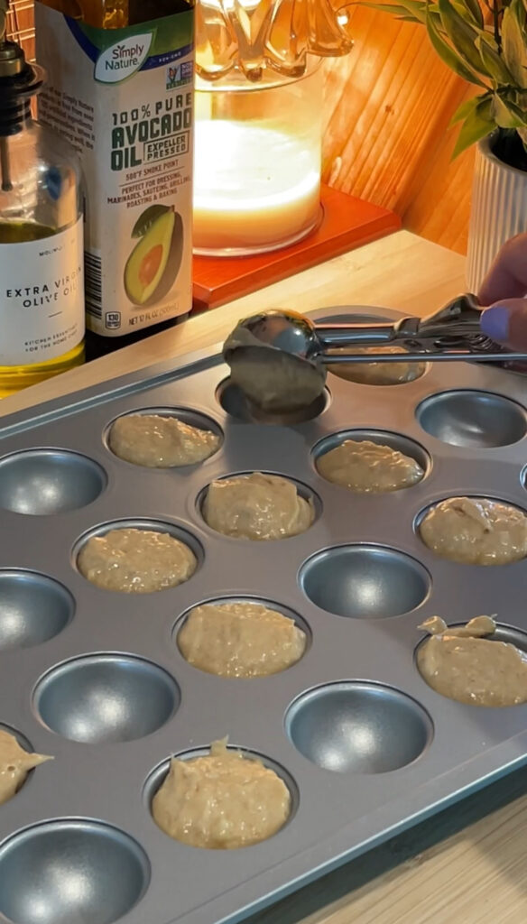 Use a small cookie scoop or spoon to fill the wells of your greased donut hole pan, then bake at 350°F for about 15 minutes, or until the tops are set and lightly golden.