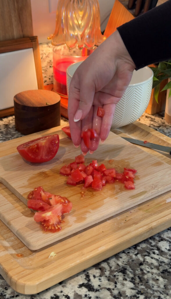 2 tsp Minced Garlic from Jar, 1/2 English Cucumber, 1 Tomato, Olive Oil, Salt