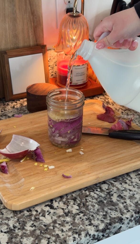 Mason Jar or Class Container, 1 Thin Sliced Red Onion, Big Pinch of Salt, 1 tbsp Honey, 1/2 cup Very Hot Water, 1/2 cup White Vinegar, 1 tbsp Minced Garlic