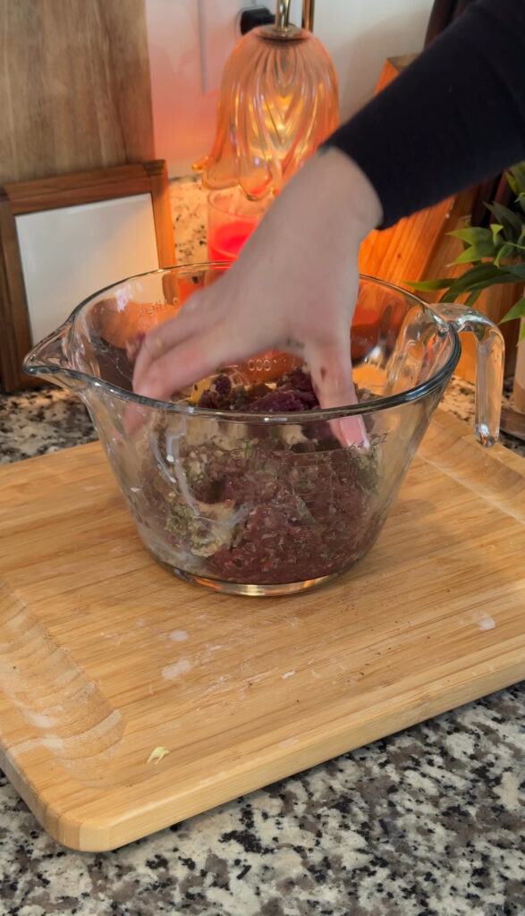 • In a mixing bowl, combine the ground meat (I used venison because I have a big freezer full), egg, soaked bread, minced garlic, and the same seasonings used for the potatoes (salt, dill, garlic powder, thyme, onion powder, and parsley).