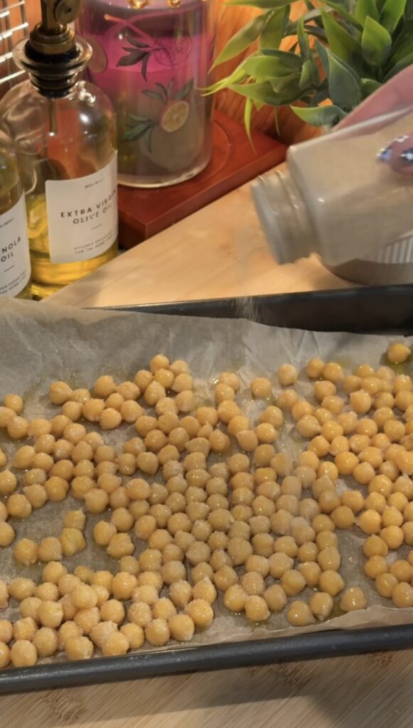 If you’re adding crispy chickpeas, drain and rinse the can, pat them dry, toss with olive oil and your favorite seasonings, and air fry until golden and crispy, about 20 minutes in the air fryer on 400F.