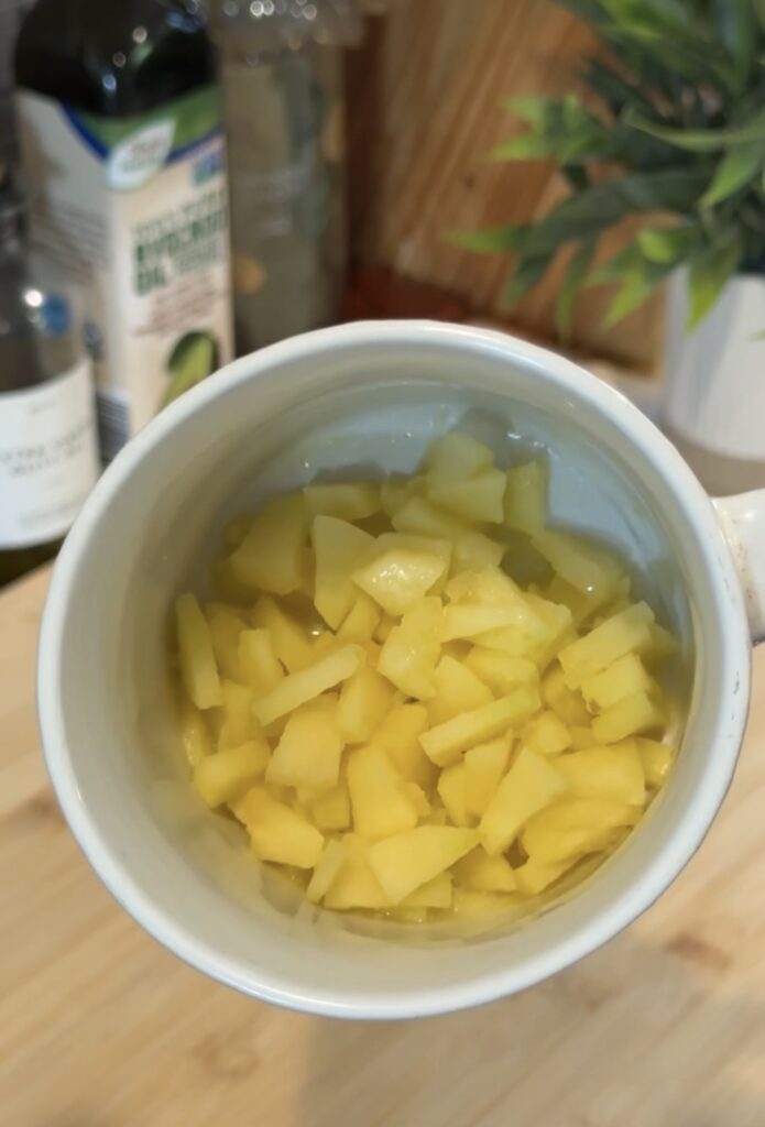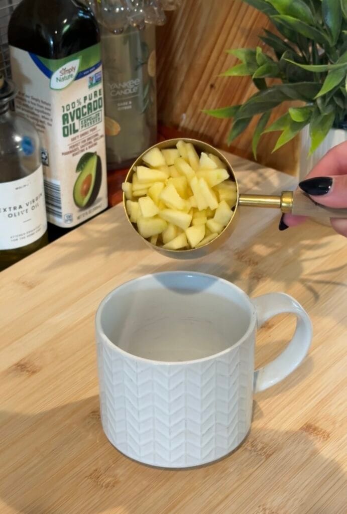I scoop those diced apples into a microwave-safe mug, drop in a teaspoon of butter, and pop it into the microwave for one minute. This softens the apples just enough so they taste like the inside of an apple pie.