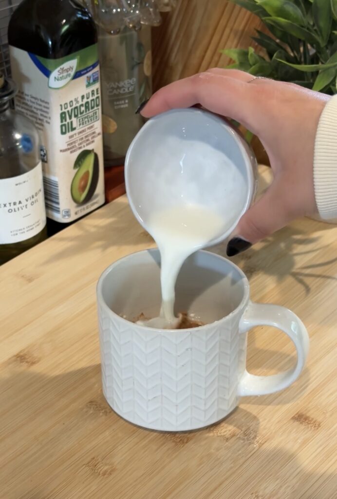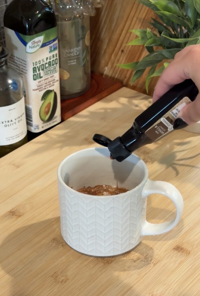 Then I add the wet ingredients—milk, a splash of oil (avocado or canola works great), and a dash of vanilla—and mix it all together really well right there in the mug until it’s smooth and combined.