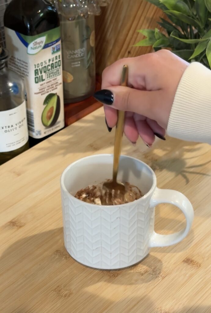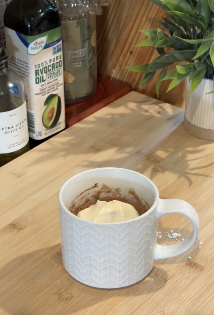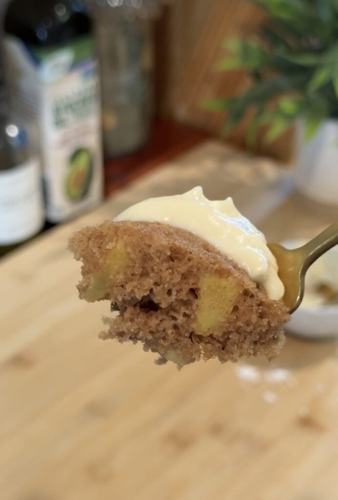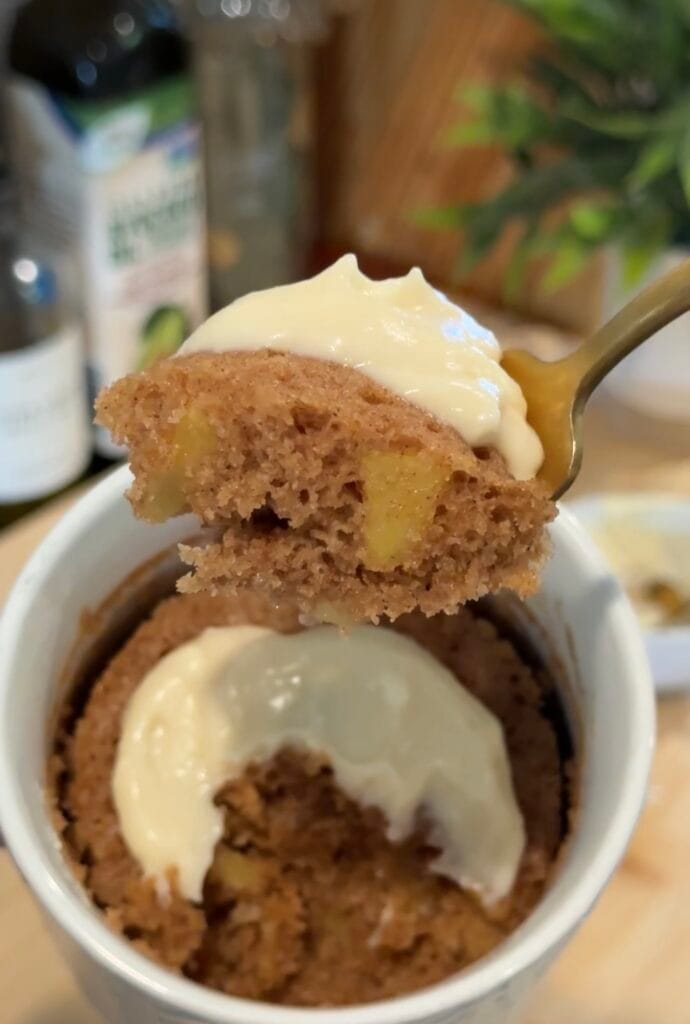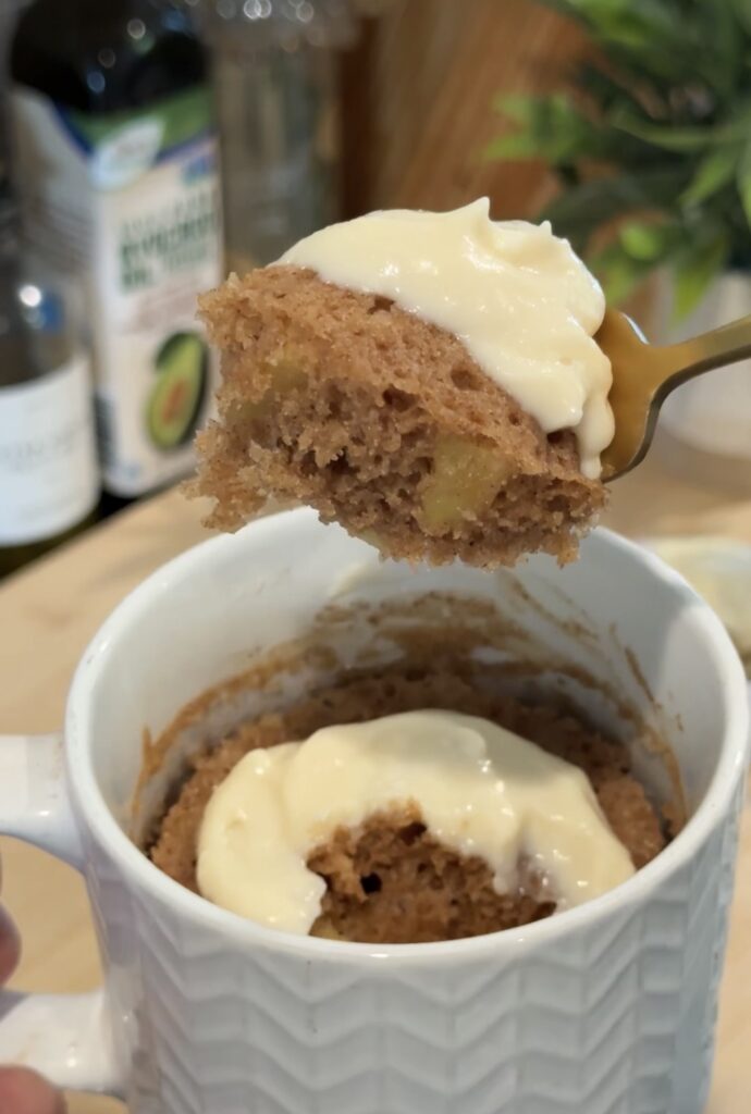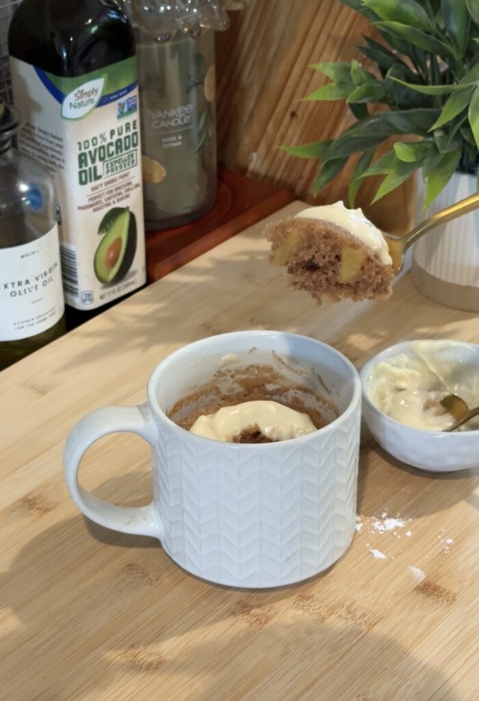 Once the mug cake is done, I top it with that frosting and dig in—it’s like a mini apple-cinnamon dessert with all the cozy vibes, no oven required.