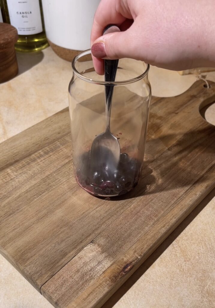 - Once they’re warm and juicy, use a spoon to gently mash them right in the cup. You don’t need to fully puree them—just enough to break them down and create a naturally sweet base at the bottom.