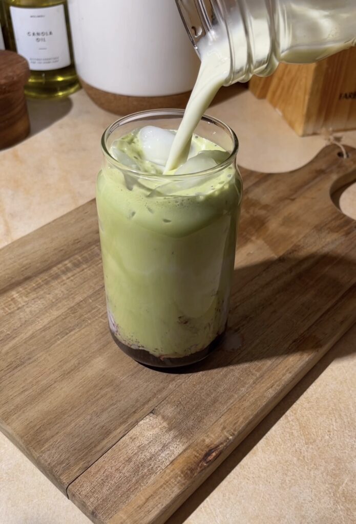 Now it’s time to prepare your matcha. Whisk your matcha powder with a splash of hot water until it’s smooth and slightly frothy. Then, slowly pour the matcha over the milk and ice.